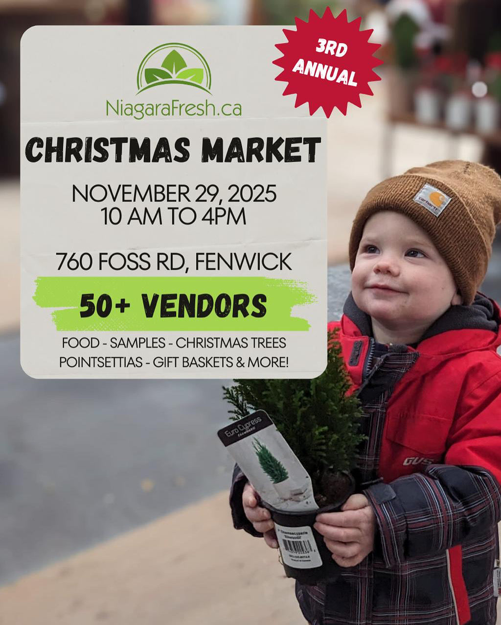 Enjoy a day filled with 50+ local vendors, delicious food samples, Christmas trees, poinsettias, gift baskets & so much more!