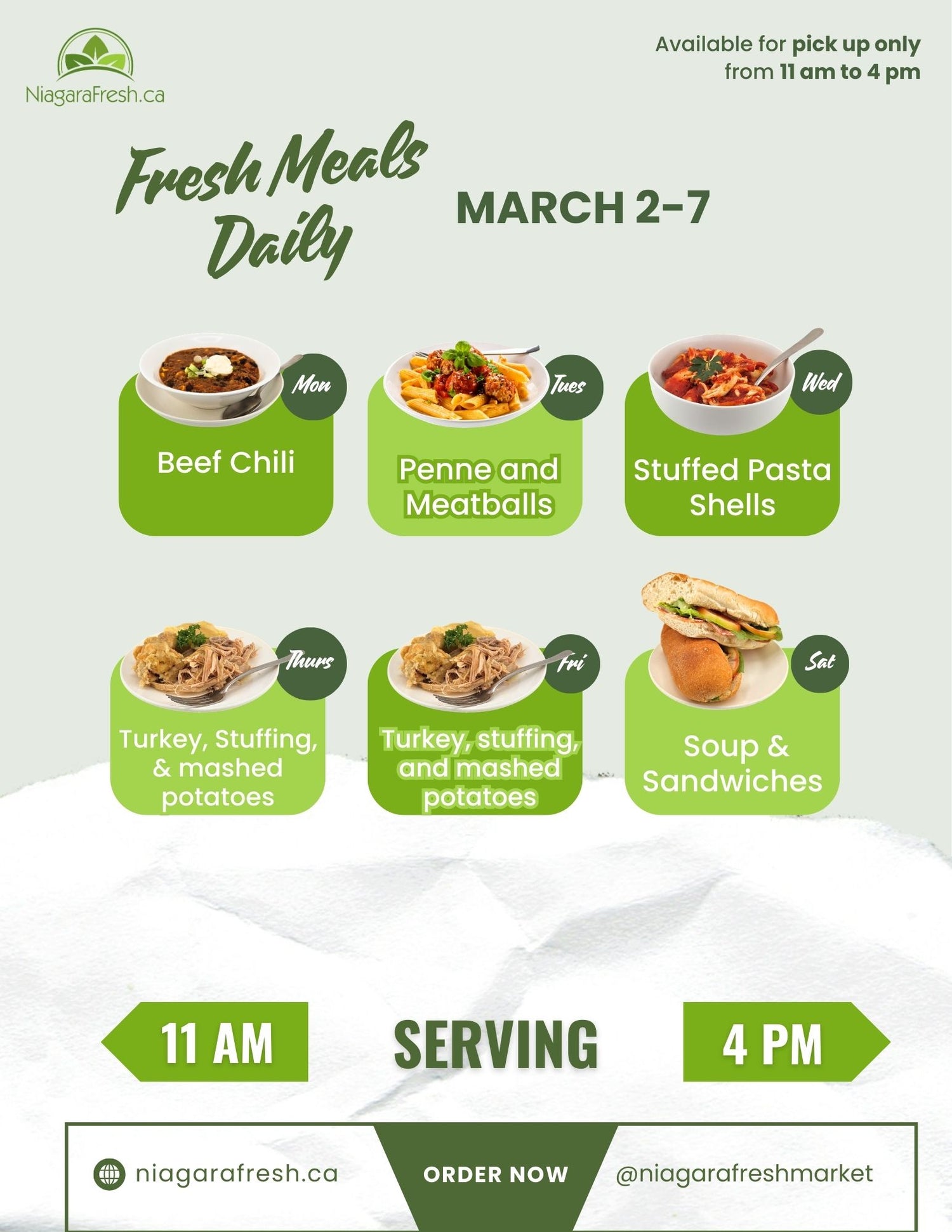 Every day we have a featured hot meal available in person only for pickup from 11am - 4pm. Our meal of the day is $10 and does not have to be pre-ordered, simply stop in!