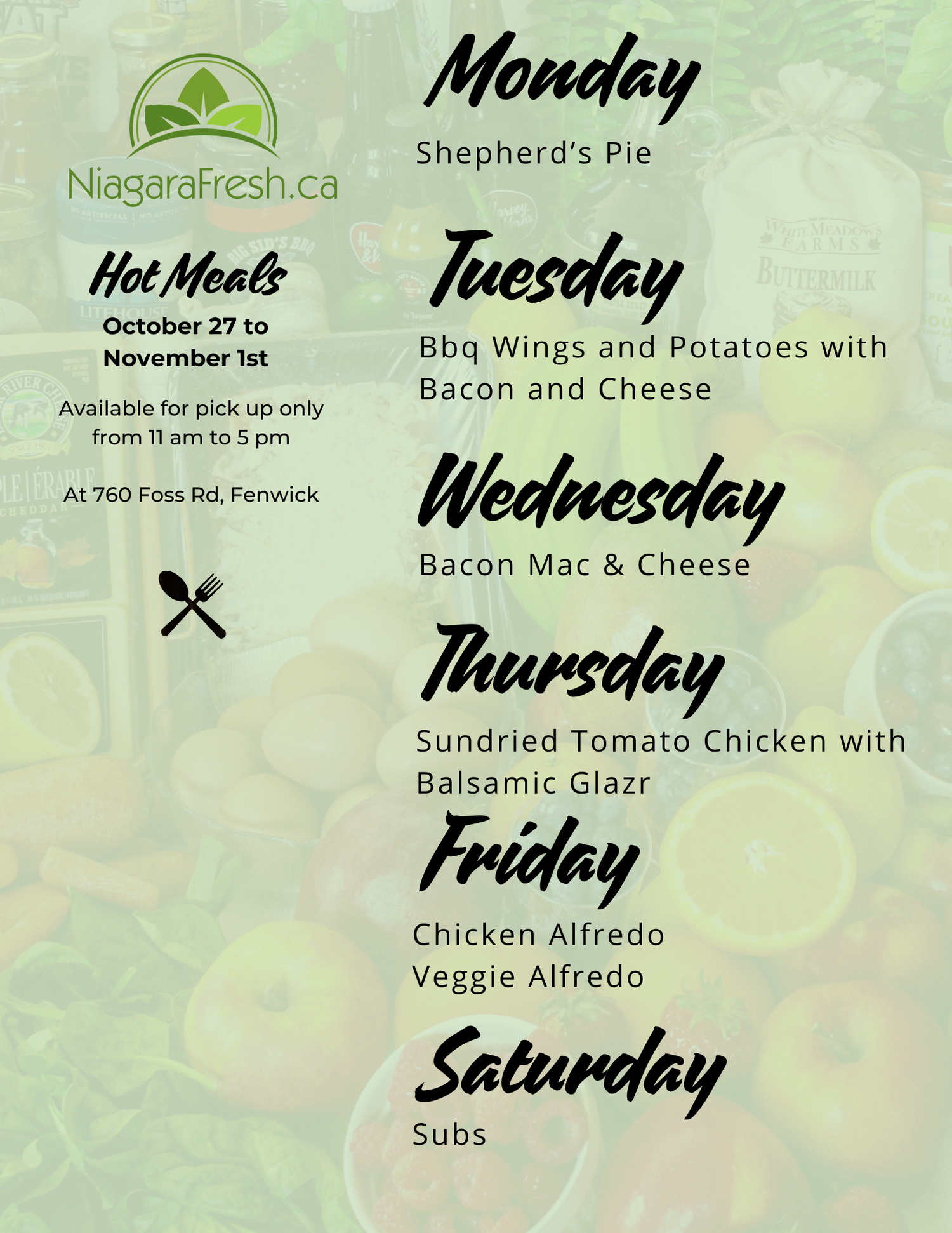 Every day we have a featured hot meal available in person only for pickup from 11-2pm. Meal of the day is $10 as does not have to be pre-ordered, simply stop in!
