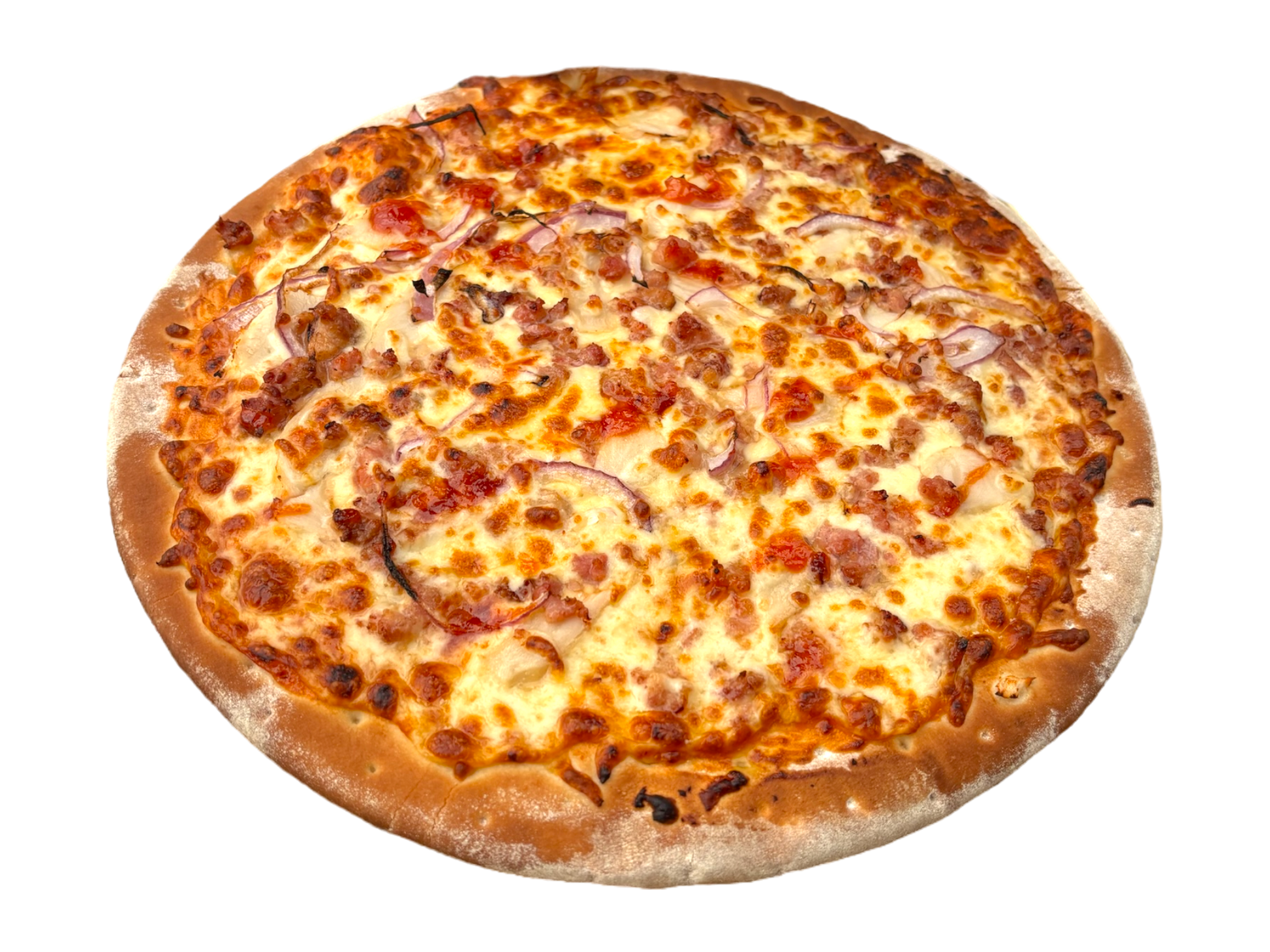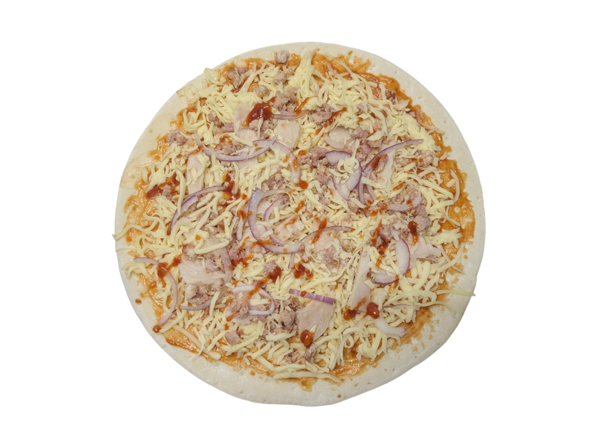 Ingredients: Pizza crust, BBQ sauce, chicken, bacon, cheese, red onion