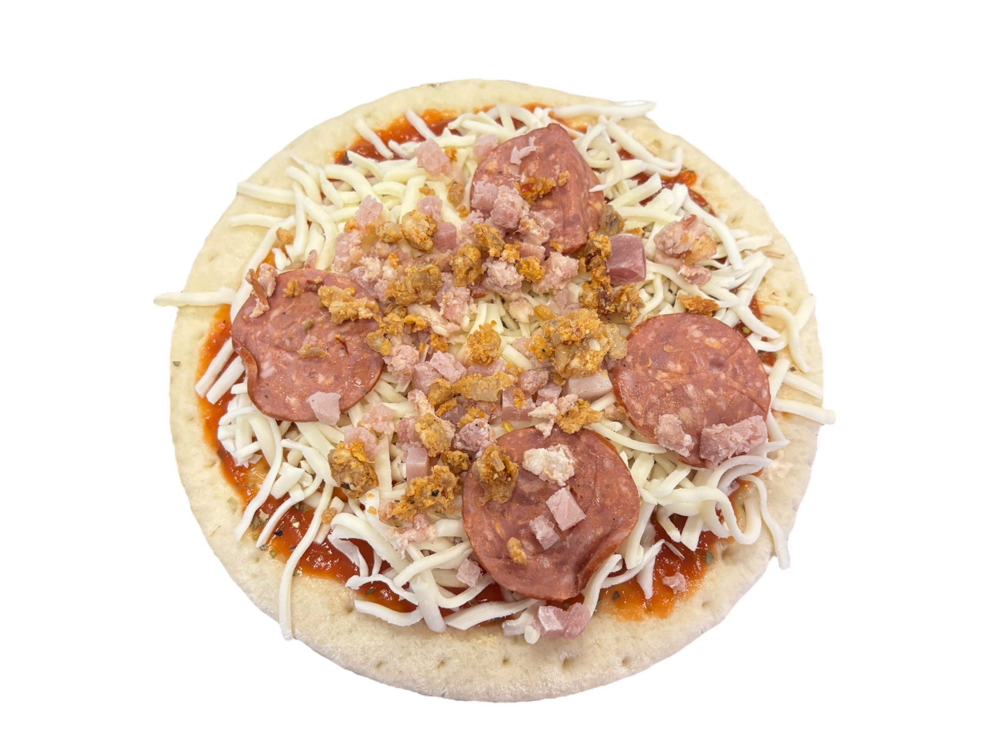 Ingredients: Pizza crust, pizza sauce, bacon, sausage, pepperoni, ham, cheese