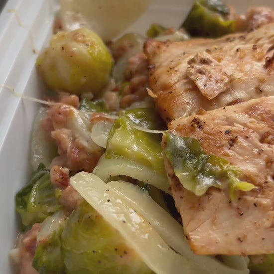 Salmon and Brussel Sprouts with Bacon and Cheese